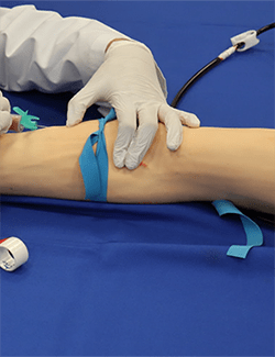 I trained in phlebotomy using a realistic arm simulator, practicing needle placement to draw blood from veins that mimic real vein-wall resistance.
